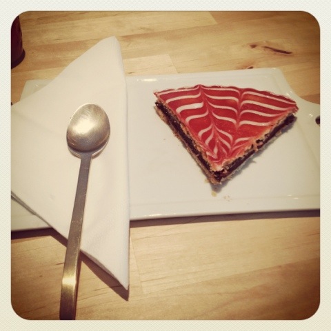 Je t’attends, a part de ser el títol d’una cançó de Charles Aznavour (us adjunto el vídeo, ja que hi som –vid. infra-), és una granja, un lloc tranquil on poder prendre un cafè i degustar la seva selecció de pastissos (el que veieu a sota és de xocolata i de maduixa, mmm), sigui a l’hora d’esmorçar o a la de berenar. També ofereixen entrepanets i algunes amanides que fan més fàcils els migdies de la business class que treballa pel voltant :-).