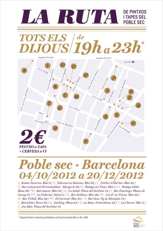 Doncs sí, degut a l’èxit que va tenir la darrera edició de “La Ruta de Tapes i Pintxos del Poble Sec” (abril-juliol), els organitzadors han considerat oportú reeditar dit esdeveniment. La Ruta comença aquest dijous dia 4 d’octubre 2012 i es perllongarà fins al 20 de desembre 2012. L’horari és de 19 a 23h (o 22h alguns locals).