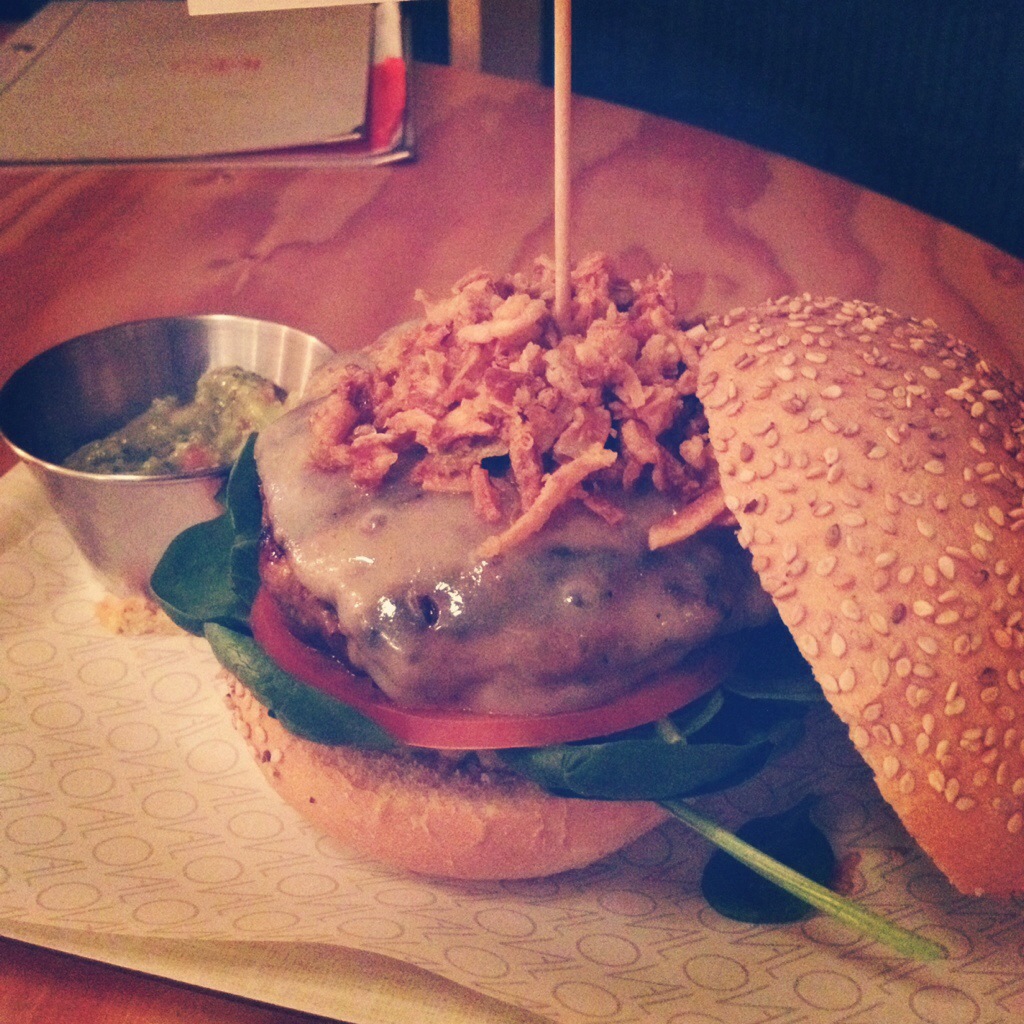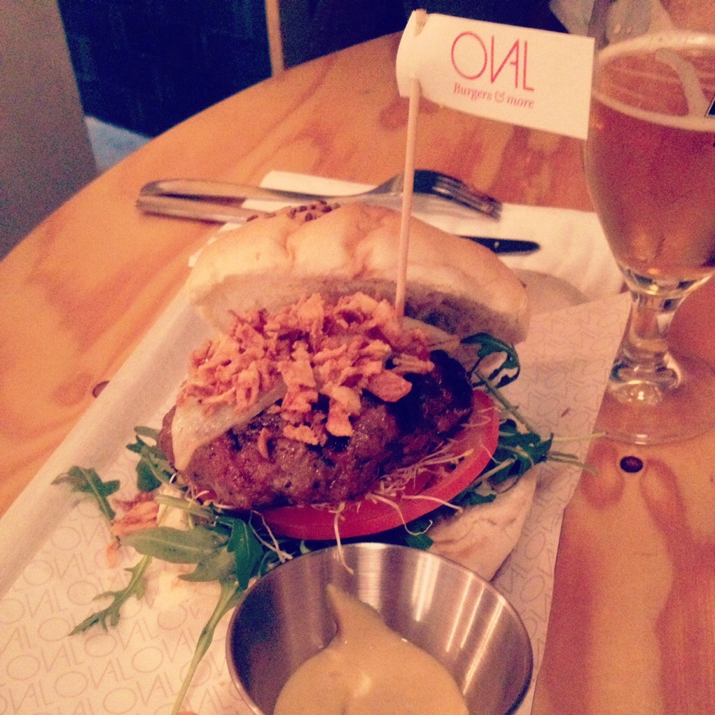 Abans de publicar aquest post he tingut temps de tornar-hi una segona vegada. Era en un altre context, concretament el d’un dinar de diumenge post “sortideta”. En aquest cas, les premisses per escollir restaurant van ser unes altres: 1) teníem una gana de bou; 2) havia de portar els meus amics forans a fer una volta turística pel Passeig de Gràcia; i 3) es va decidir per unanimitat anar a menjar una hamburguesa. Ho vaig tenir clar: “Tem que conhecer o Restaurant Oval, vai vos encantar!