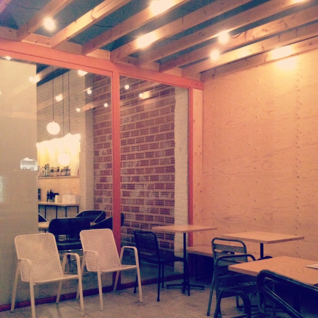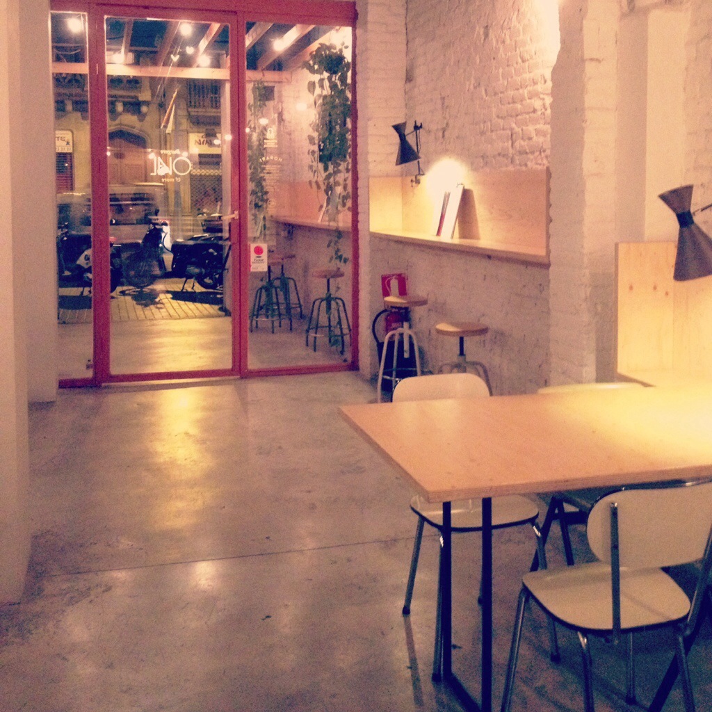 El local? No té secrets (ni parets, quasi bé :-)). No pretén ser romàntic, si algú m’ho pregunta. L’espai, d’aproximadament 200 m2, fou dissenyat per l’empresa Flexo Arquitectura (mireu la seva pàgina web, a mi m’ha encantat!!). Té un marcat aire industrial gràcies als materials originals del s. XIX, els sostres de 4 metres d’alçada, les columnes d’acer i les parets de maó foradat. El mobiliari i la il·luminació hi acaben de donar el toc nòrdic que s’hi aprecia de fora estant (especial menció a les cadires i tamborets reciclats dels Encants i als flexos que serveixen per a il·luminar les taules).