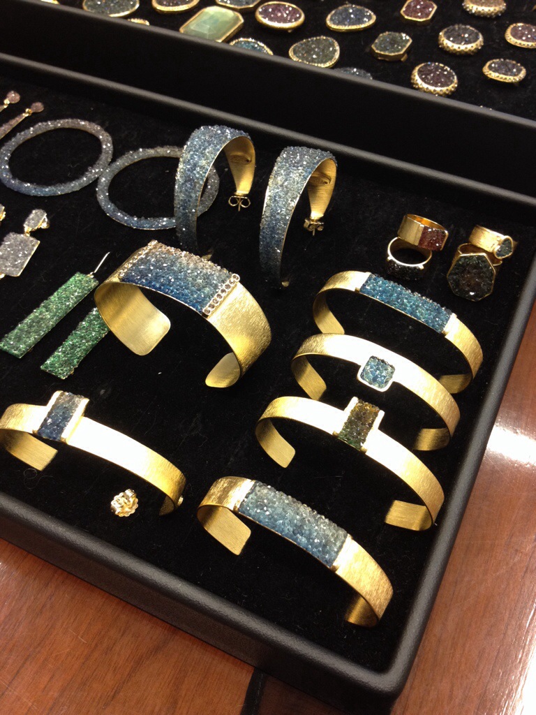 A més dels cristalls utilitzen metalls adequats per a les tècniques de joieria, com el bronze, a més de pedres semi-precioses naturals i capes d’or per a l’acabat final.
