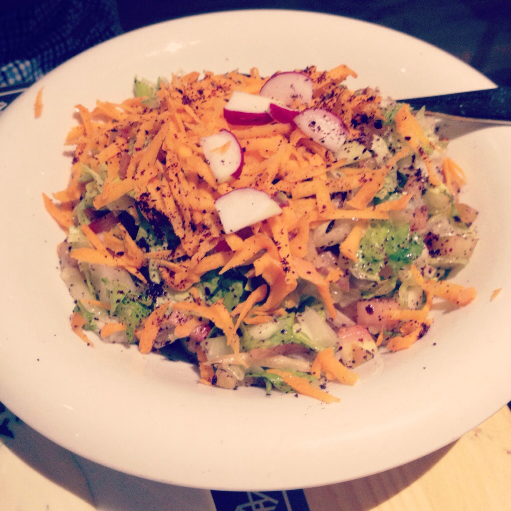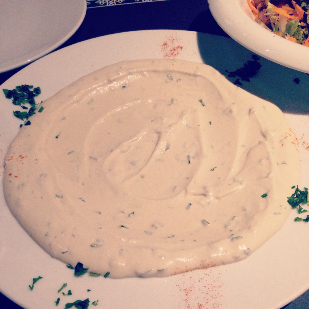 Els entrants que veieu a les següents fotografies són, el primer, l’hummus de sèsam, de textura força espessa però amb molt de sabor i, el segon, l’amanida fatoush, una aposta no gaire arriscada però no per això menys saborosa. Aquesta amanida és coneguda com amanida de pa àrab i conté cogombre, pastanaga pa àrab, tomàquet, olives, menta, coriandre… Altres entrants interessants són el wakar enab (fulles de parra farcides d’arròs, julivert, tomàquet, ceba i menta) o el kebe (croquetes de búrgul -aliment preparat a base de grans de blat- farcides de carn amb ceba i pinyons).