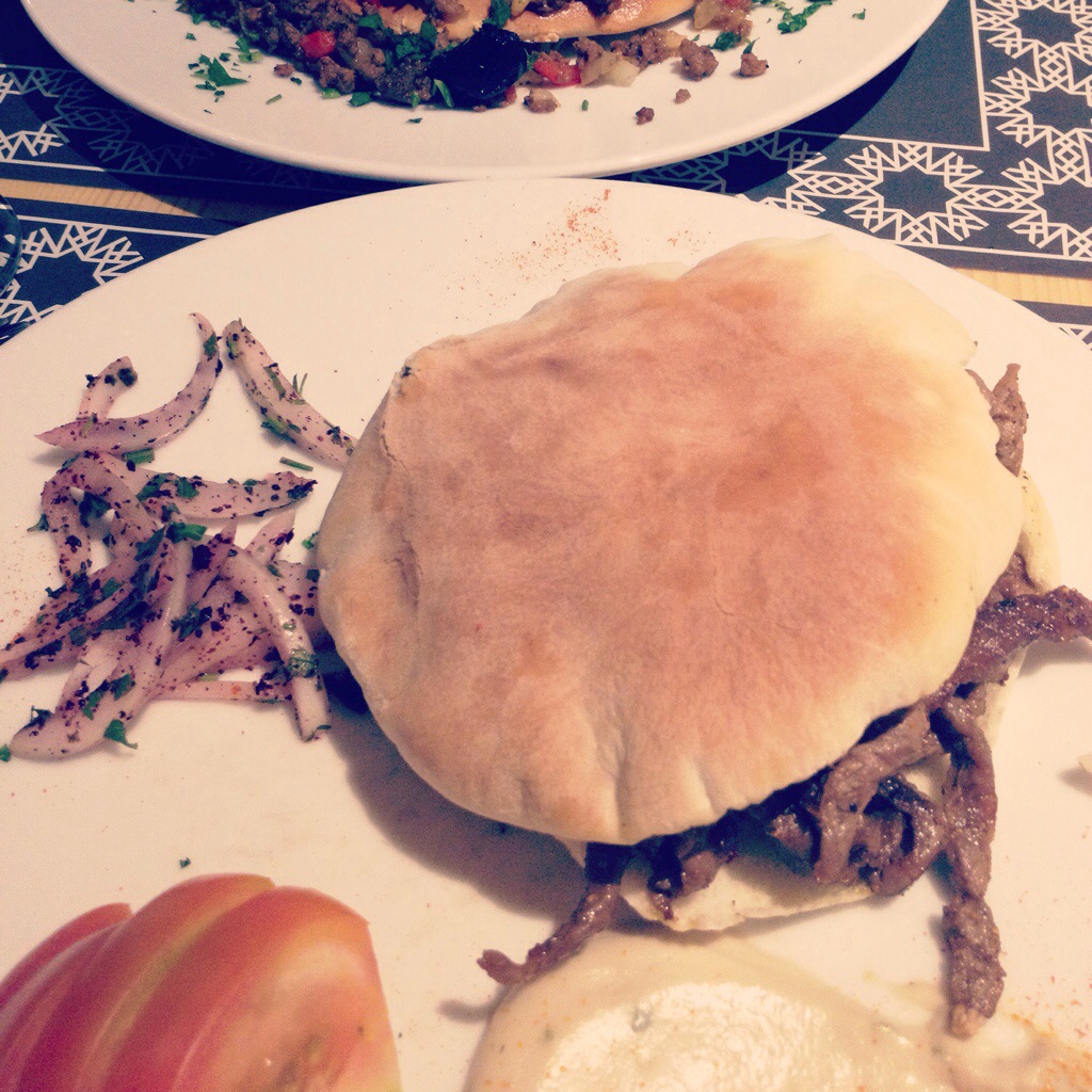 Plats principals: A més d’haver-hi un gran assortiment els plats principals són molt complerts (i sinó jutgeu vosaltres mateixos les següents fotografies. A falta de recordar el nom tècnic (una té memòria però no tanta) us els descriuré amb els ingredients: la primera foto correspon a un plat de carn picada de vedella amb pinyons, pebrot, ceba, olives negres, julivert i coriandre i per sota un pa àrab ideal per fer “bocaditos”. La segona és una espècie d’entrepà de tiretes de carn de vedella amb un toc de curri i acompanyat d’hummus, tomàquet i ceba especiada.