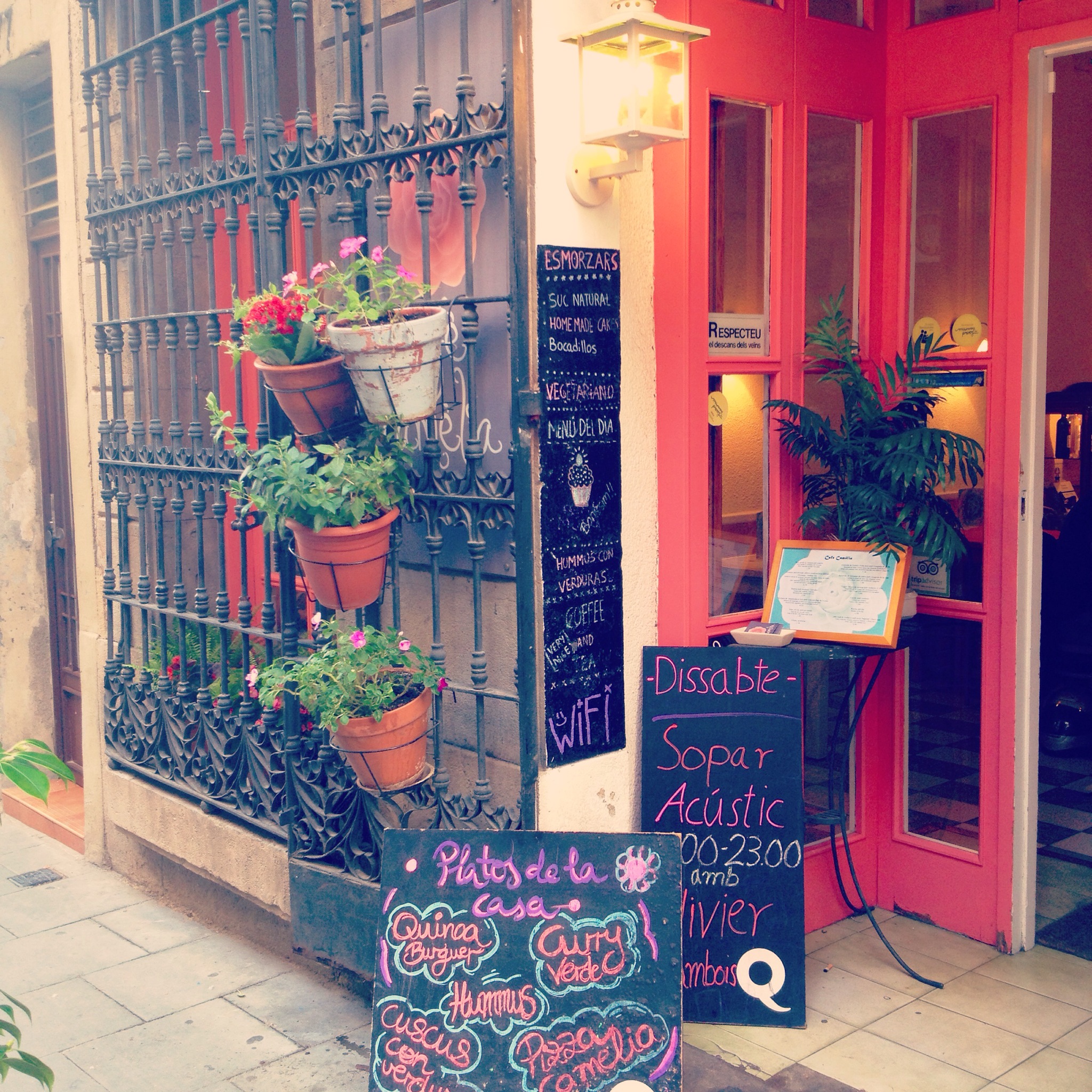 Cafè Camèlia és un raconet per anar a dinar/sopar (tenen plats vegetarians – entre d’altres, cous-cous, quiches, veggie burgers, hummus…-), quedar per a berenar (fan uns pastissos i uns muffins casolans que tenen una pinta espectacular) o fer una copa de vi (tenen vins a copes -de blanc, per exemple, Perro Verde-).