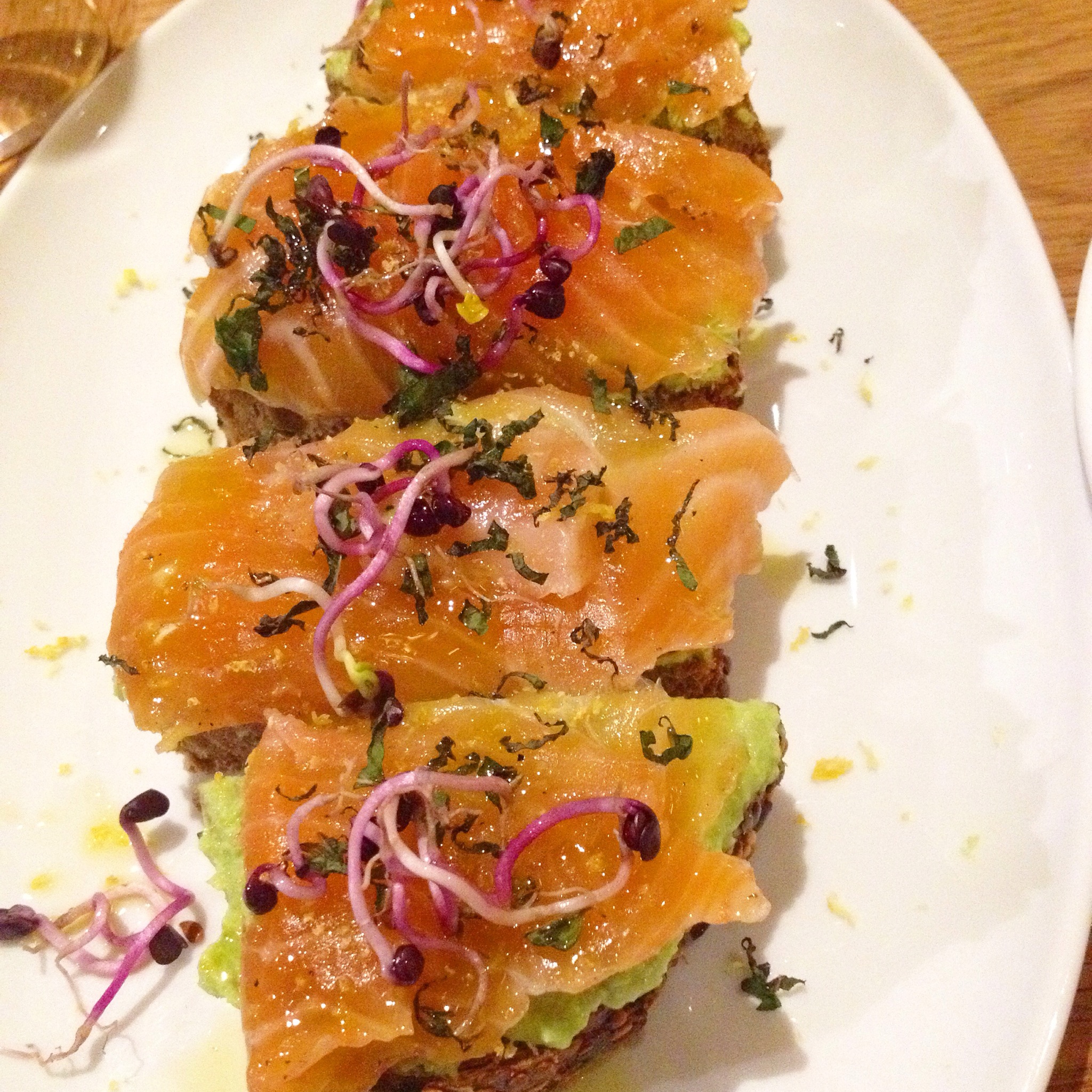 2) Salmó sashimi toast (6 €): salmó sobre d’una llesca de pa torrada amb crema de pèsols i menta. La combinació dels pèsols i el salmó és, francament, molt encertada.