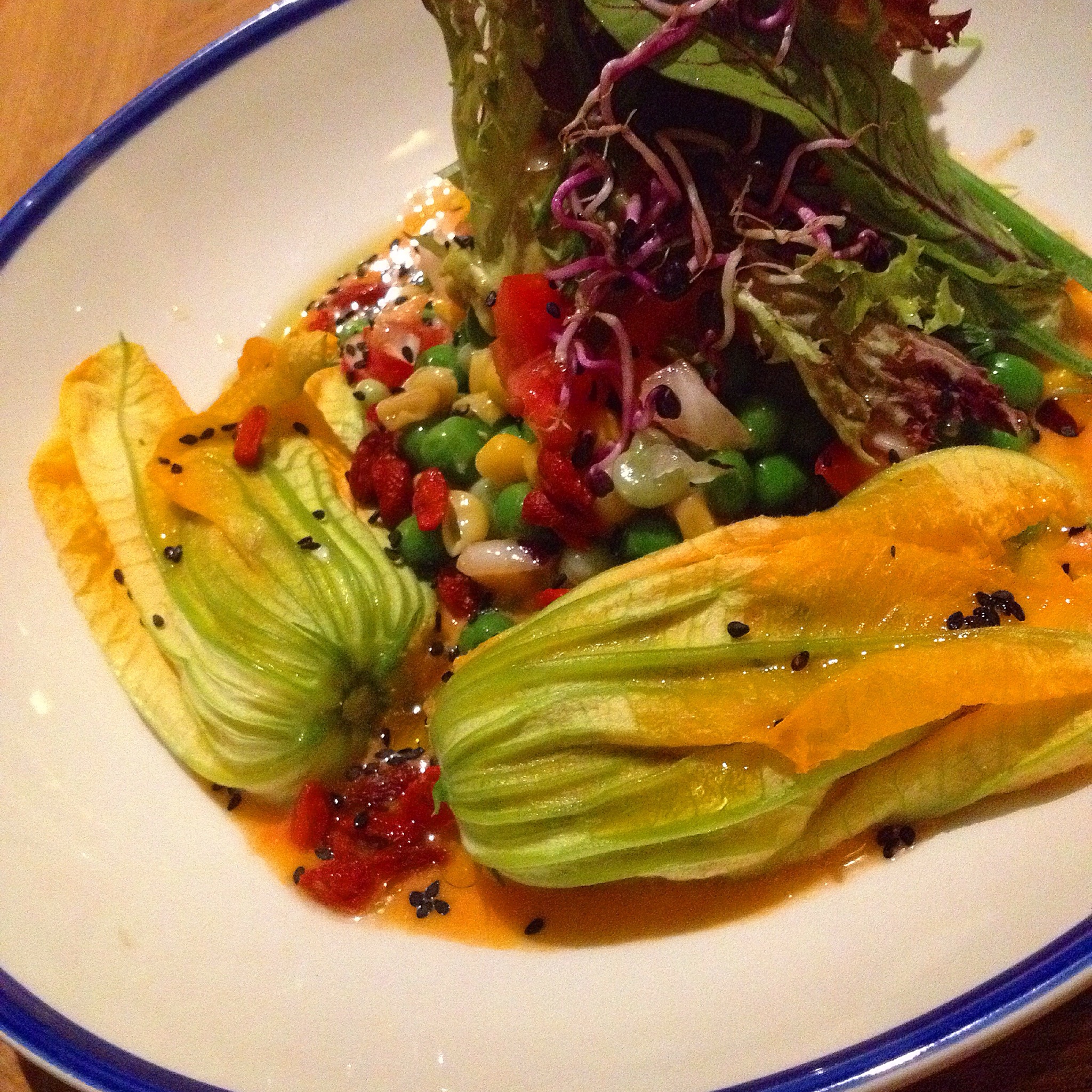 4) Raw Zuchinni Blossoms (13 €): flors de carbassó farcides de crema d’anacards, tomàquet sec i alfàbrega, pèsols, faves verdes, pastanaga, blat de moro, guacamole, picos de gallo, salmorejo i baies de goji. La presentació espectacular i nutritivament molt complet.