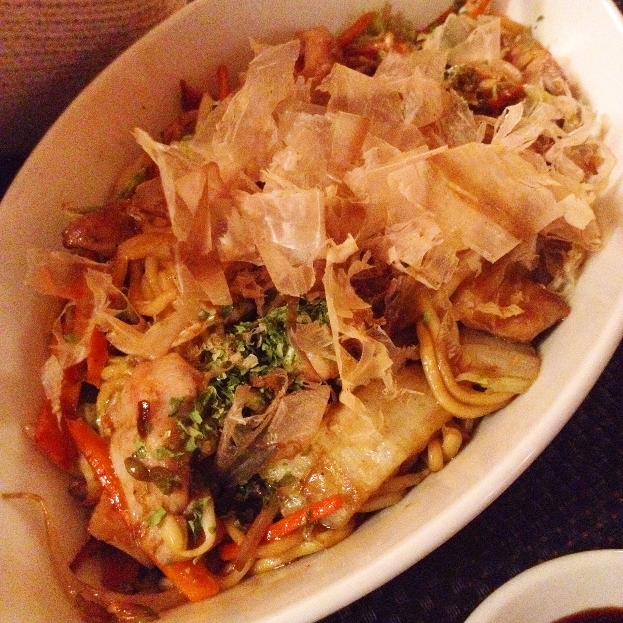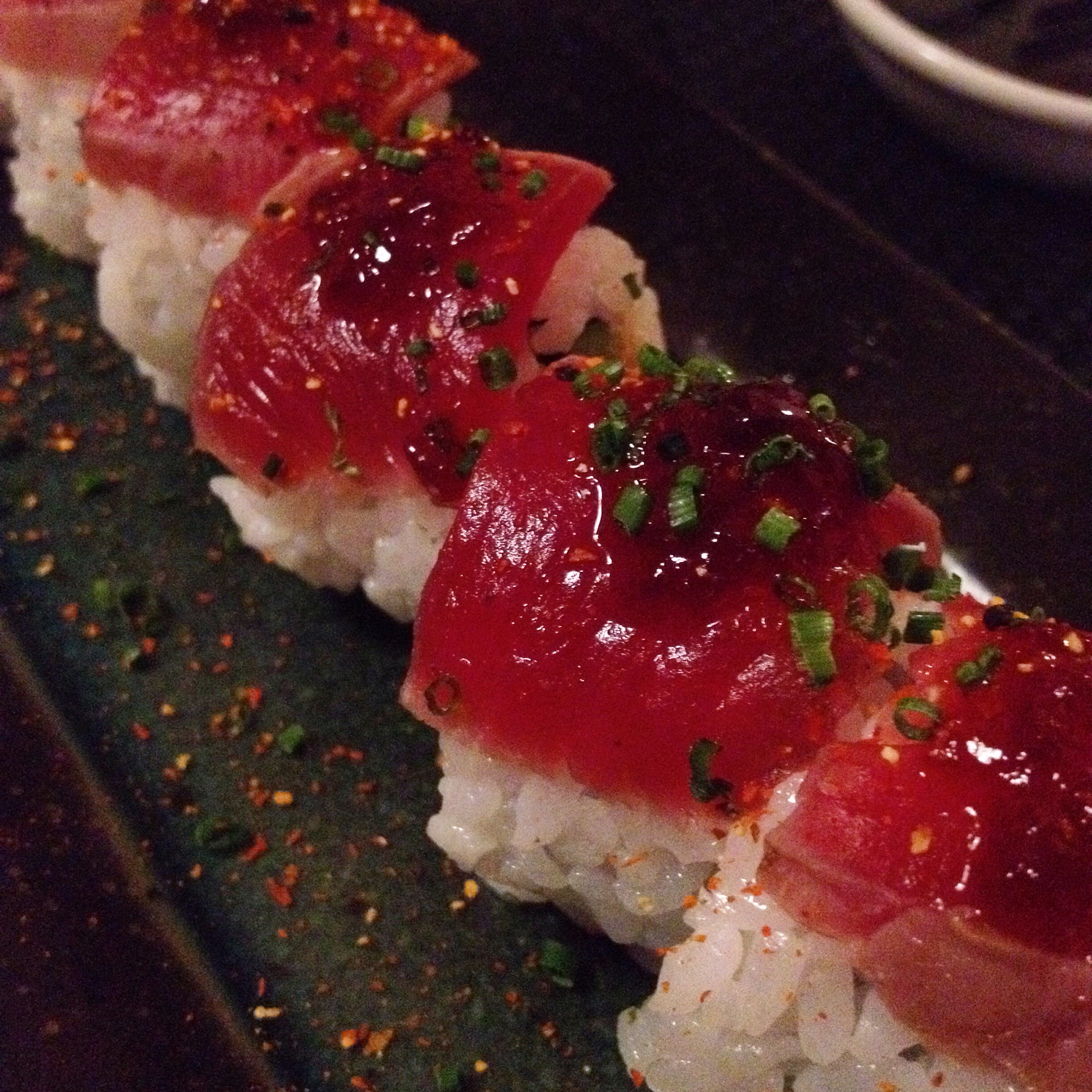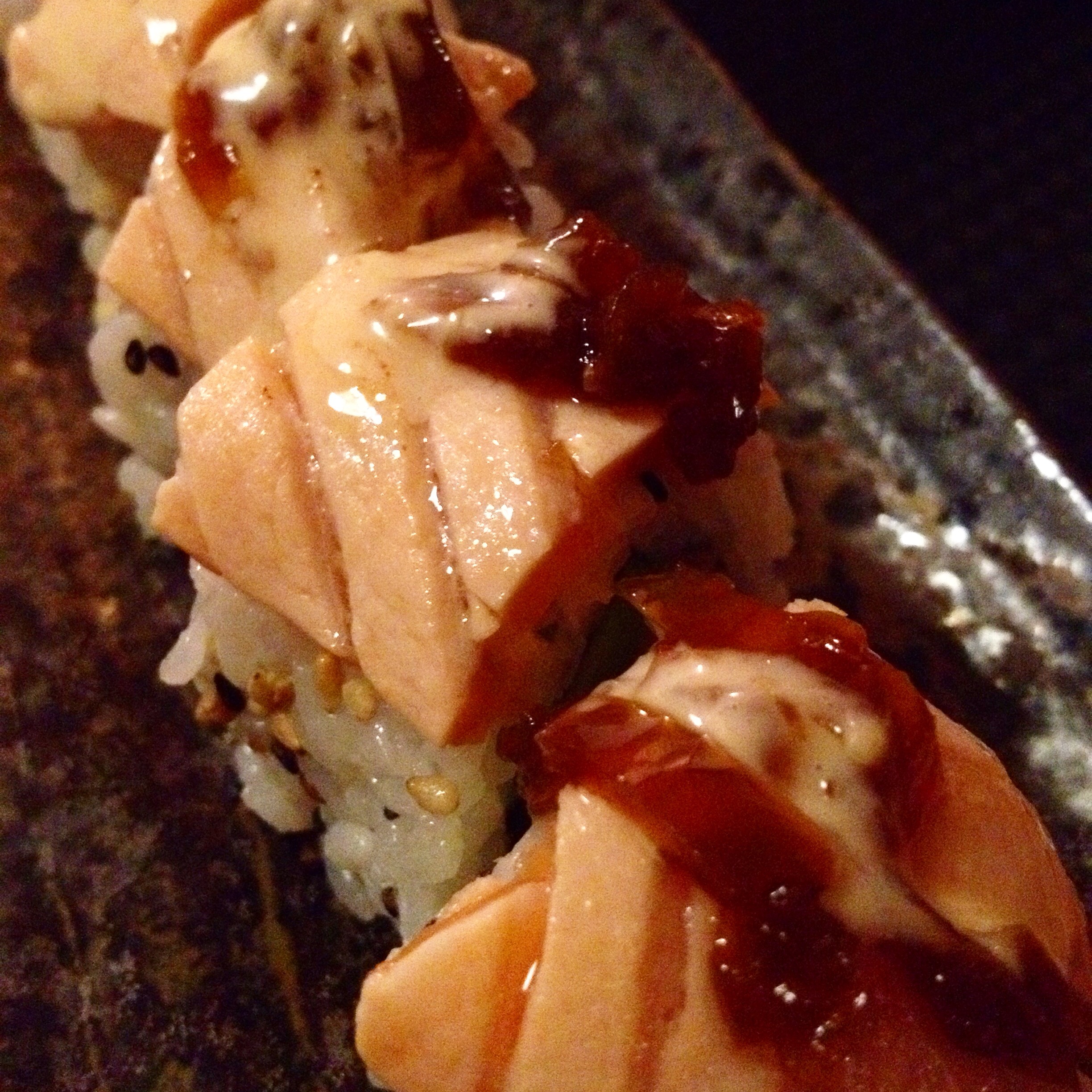 Les tres següents fotografies corresponen, la primera a uns yakisoba amb pollastre, molt bons (8,50 €); la segona a uns urakami “tatami” amb tonyina, espàrrecs, cobert amb tonyina tataki (13,50€); i la tercera a uns uramaki nagoya de llagostins en tempura, miso mayo (un condiment japonès), alvocat, cobert de salmó i ceba caramel·litzada (12,50 €). Aquest darrer, per a mi, el millor plat de la nit. Bé, un dels postres quasi el va guanyar ;-)…
