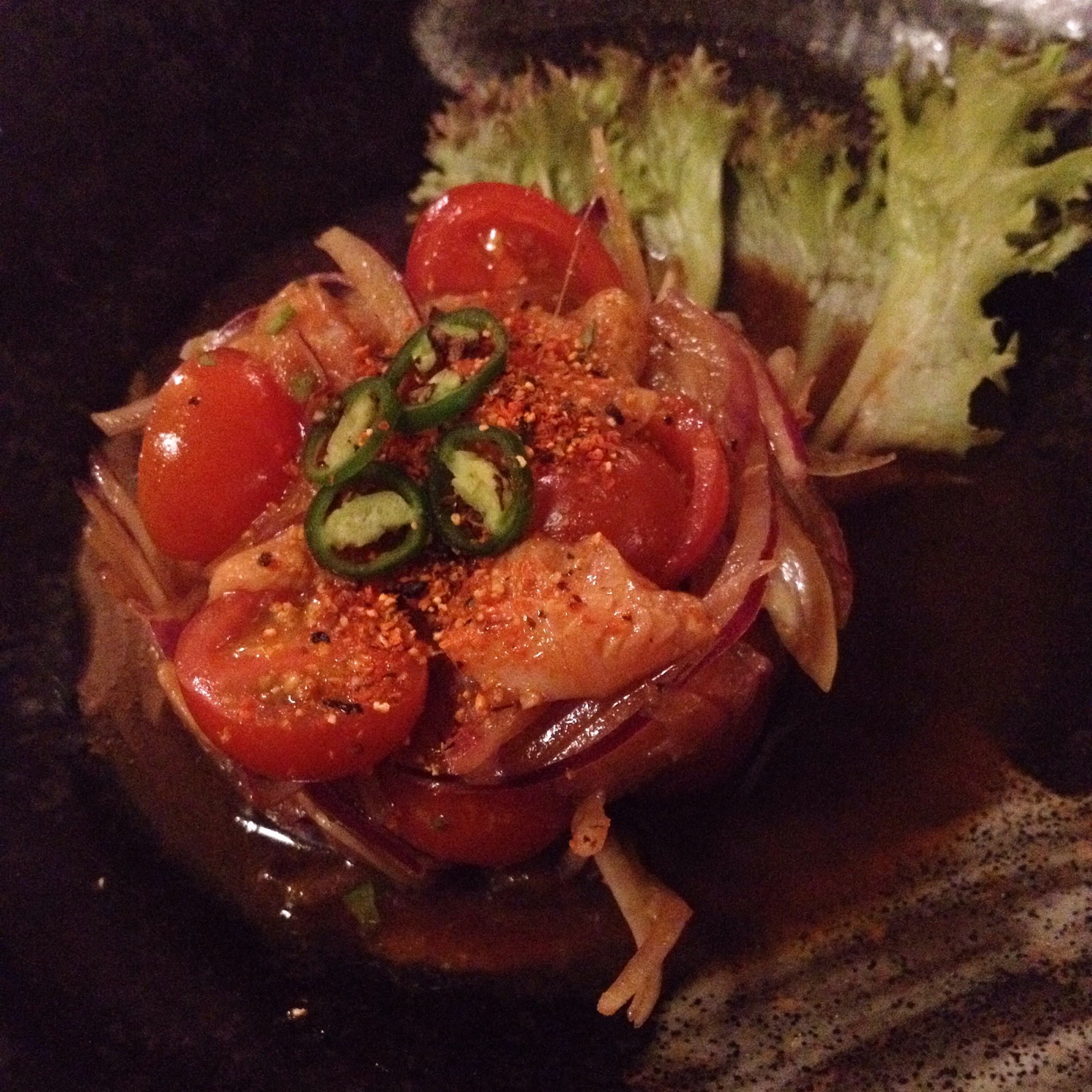 Les dues primeres fotos corresponen a dues de les propostes de la carta, la primera: tempura de cranc de closca tova amb llima (11,90 €). Un sabor força curiós i interessant, acompanyat d’una espècie de maionesa. I la segona, al ceviche de salmó amb llima, menta, tomàquet xerry, ceba vermella i amaniment japonès (11,50 €). Jo em quedo amb el segon dels suggeriments.