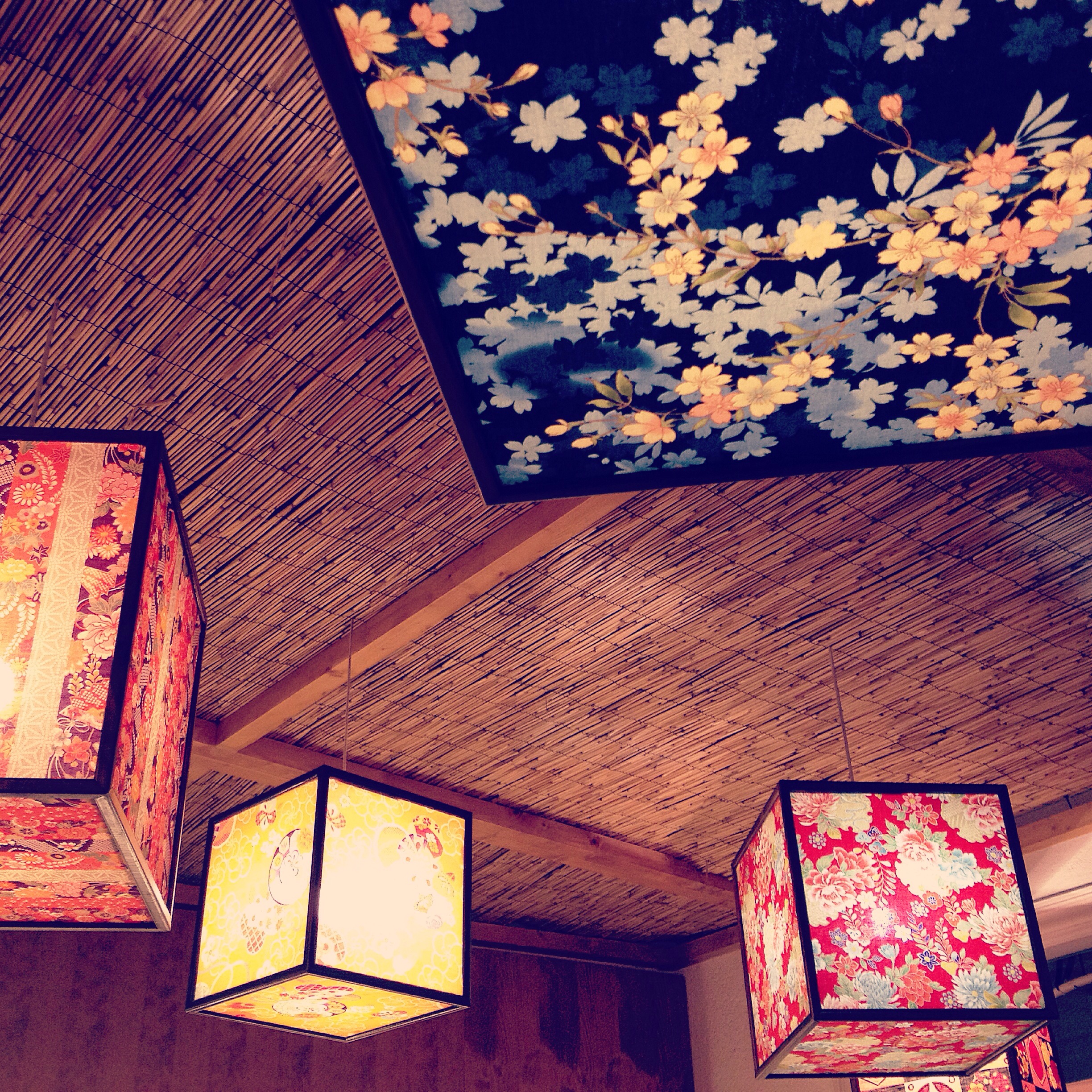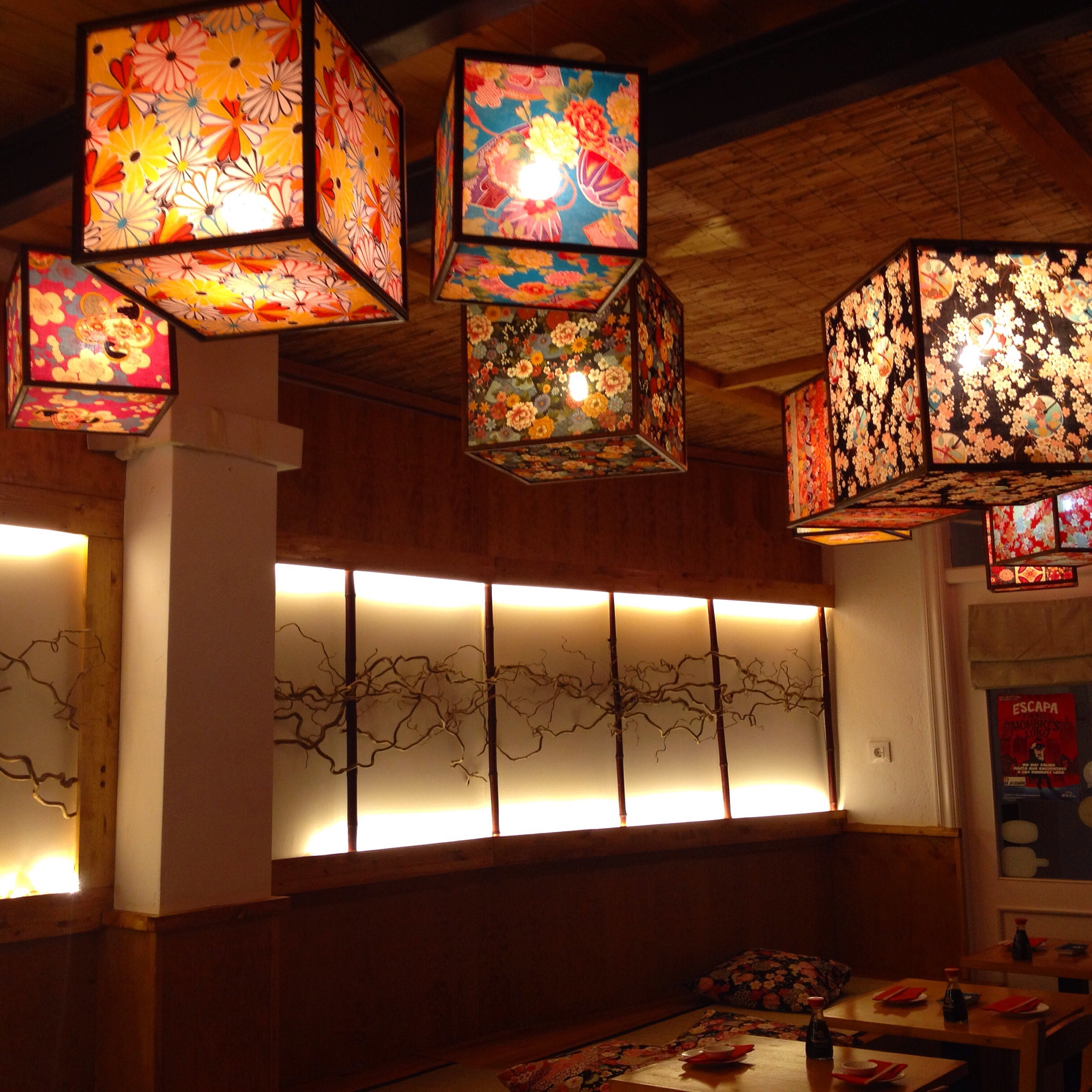 Quan entres a la primera sala del restaurant resulta impossible no dirigir la mirada cap al sostre. Molt probablement trauràs el mòbil de la butxaca fins que aconsegueixis fer la millor foto a les originals làmpades de colors quadrades que hi ha penjades al sostre.
