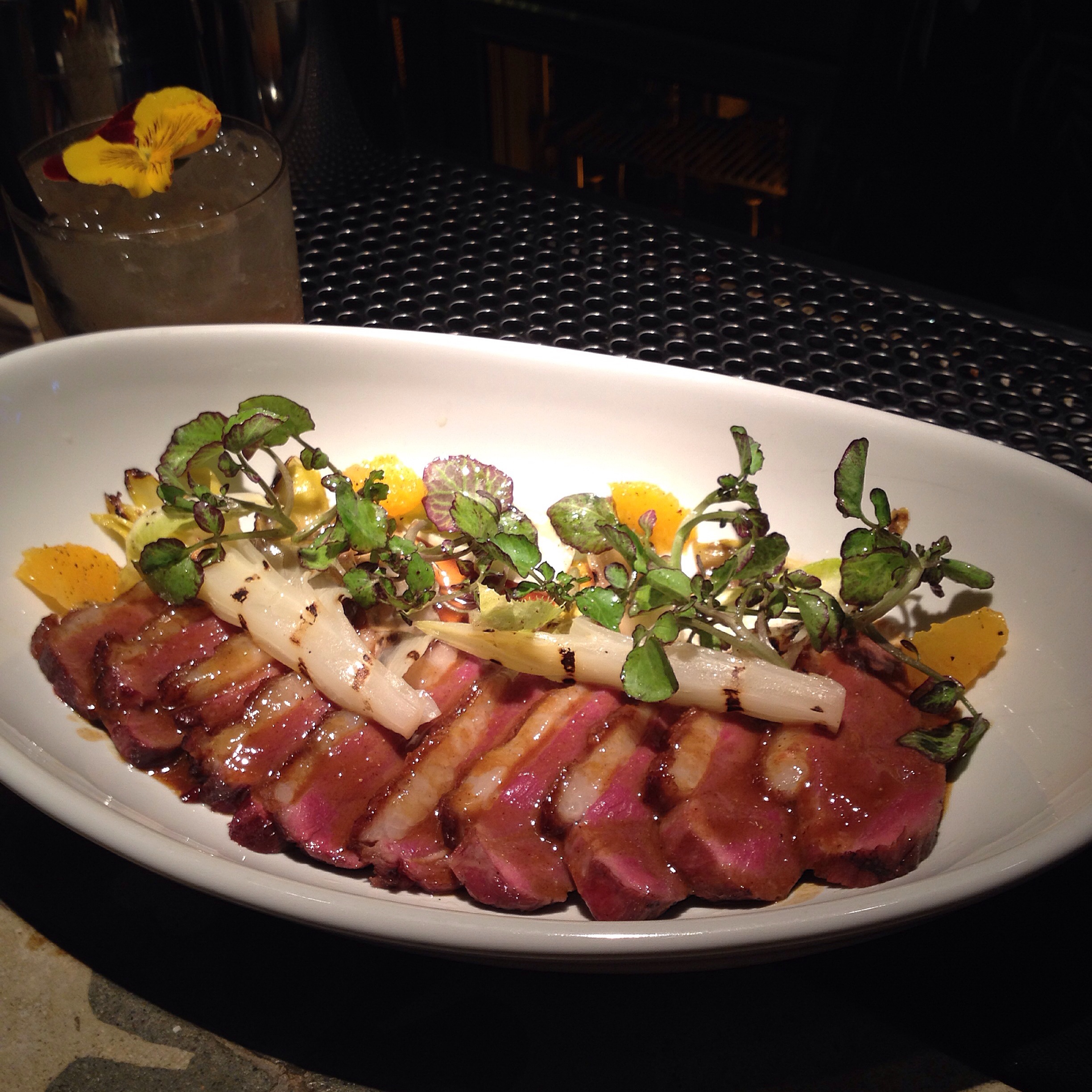 5. Magret d’ànec (5 espècies, taronja sanguina, endívies caramel·litzades + Mapuchinha (pisco Gobernador, cumquats, horse radish, llimona, aigua de flor de taronger i acetto de gerds)