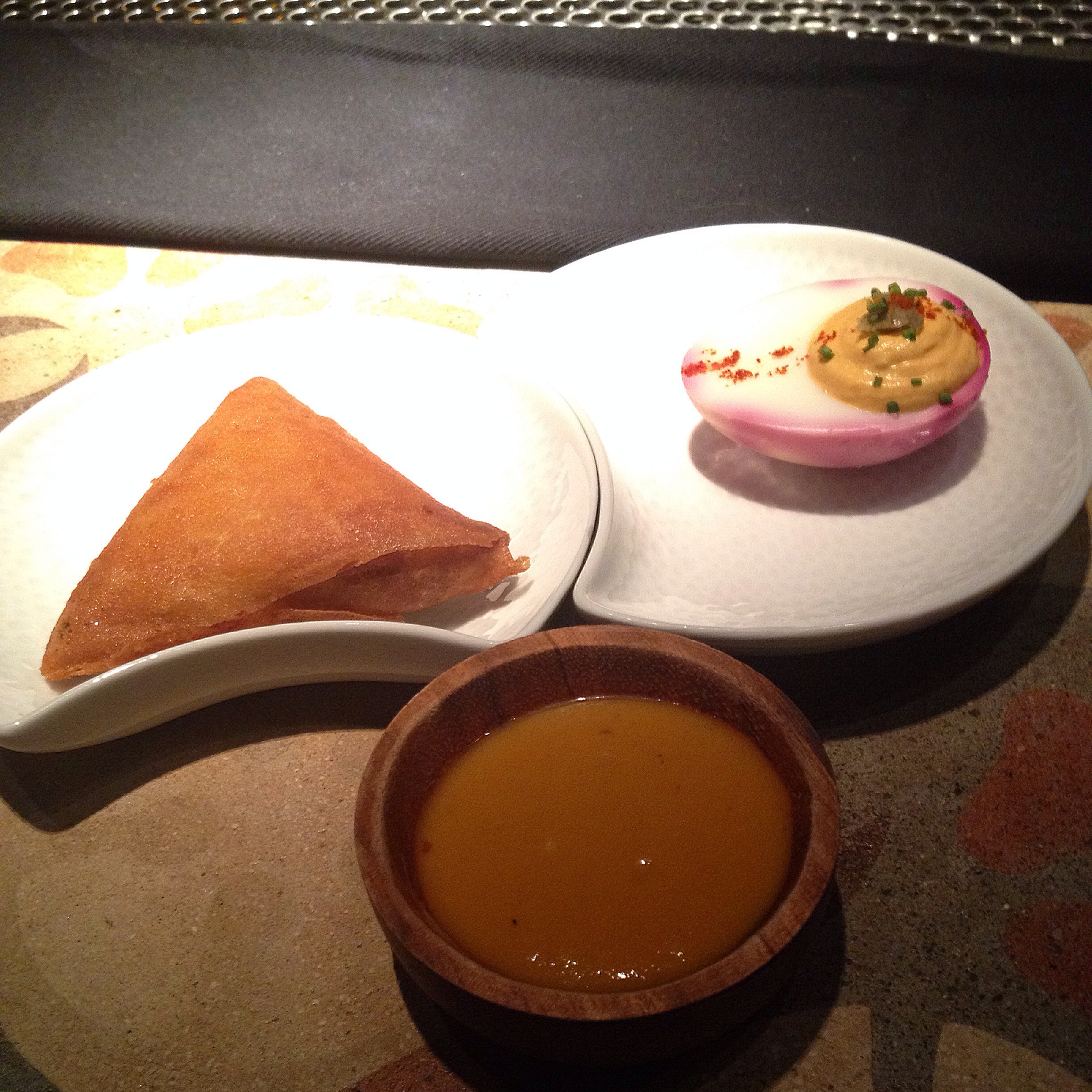 1. Deviled egg / samosa de peix (amb salsa de mango i tamarinde) + Mascetti (mezcal San Cosme, suze i vermut)