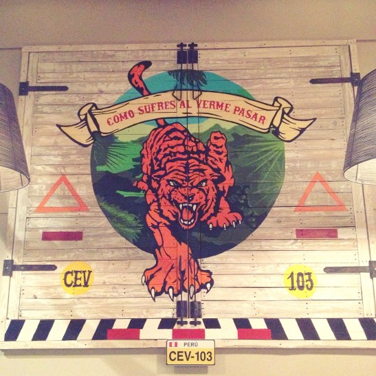 Aquesta paret que veieu a la següent fotografia ens recorda que dins de la cuina peruana la “llet de tigre” és l’ingredient imprescindible de tot cebiche. Normalment es prepara amb les sobres del peix en qüestió, batent-les juntament amb suc de llima, api, all, sal, pebre negre i ceba. De varietats n’hi ha desenes, dependrà de cada restaurant i de cada xef.