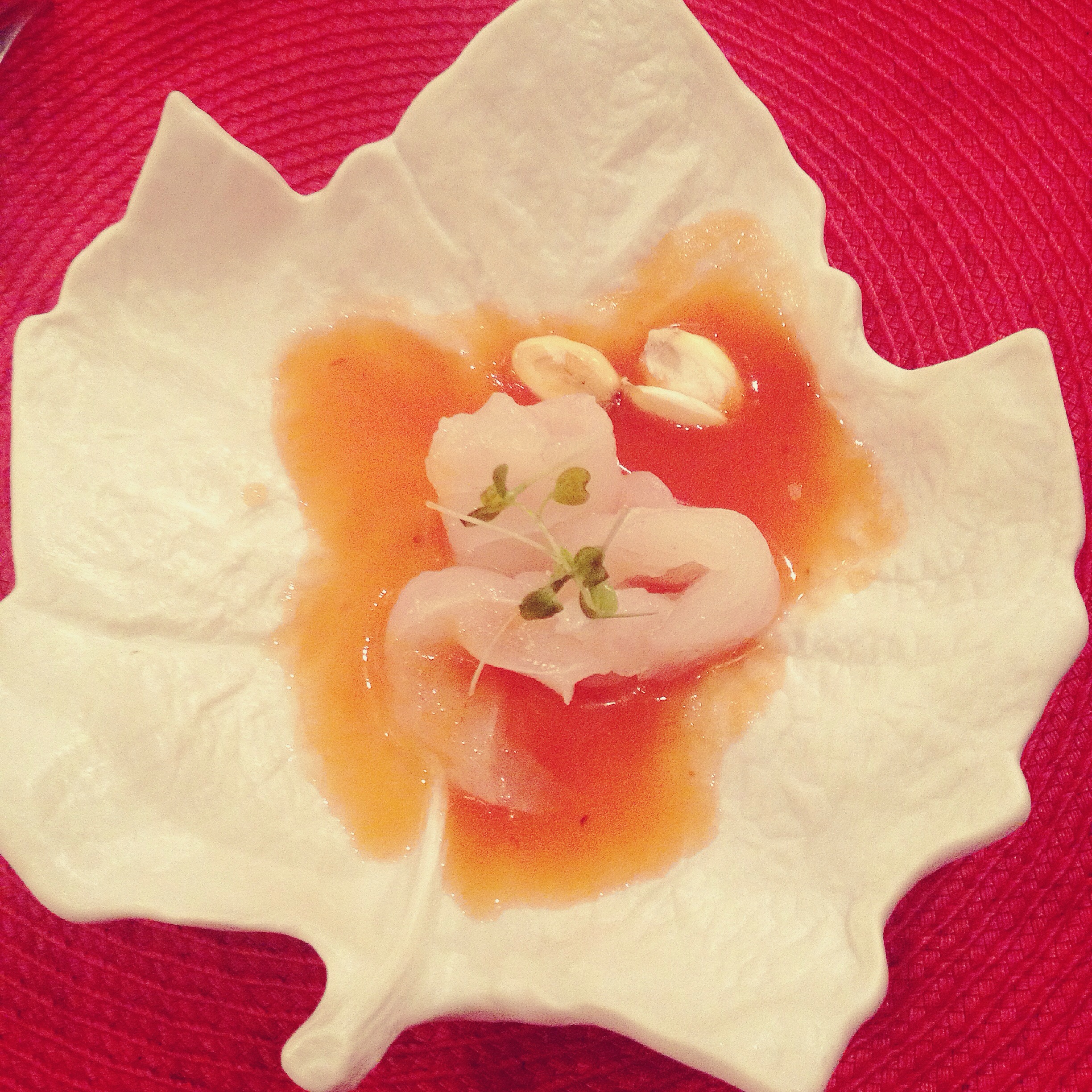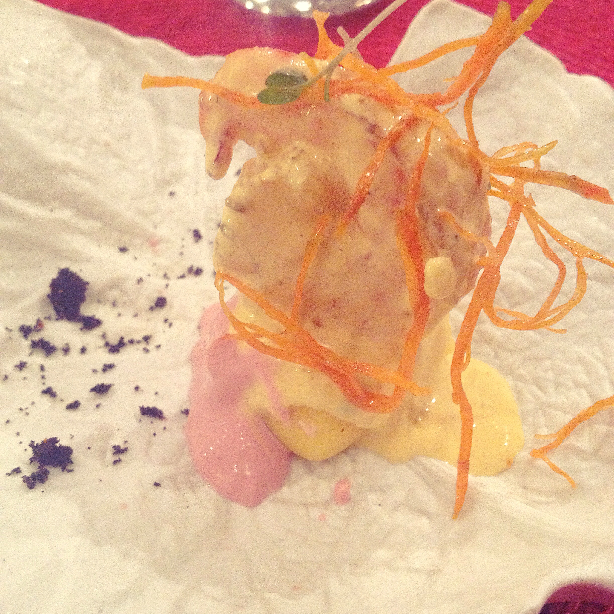 3. “Tiradito” de corvina salvatge amb salsa de pinya i “rocoto” amb fils de moniato: