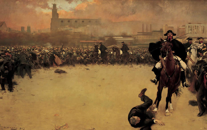 Un altre dels originals que podreu trobar al Museu (aquest però a l’entrada del mateix així que fixeu-vos-hi bé!) és el titulat “La Càrrega”, quadre que representa l’ambient de tensió social de final del segle XIX a la Barcelona de la revolució industrial. Casas es va inspirar en les detencions fetes entre els anarquistes després de l’atemptat del carrer dels Canvis Nous a Barcelona contra la processó del Corpus, el 7 de juny de 1896, i que va culminar en el Procés de Montjuïc.