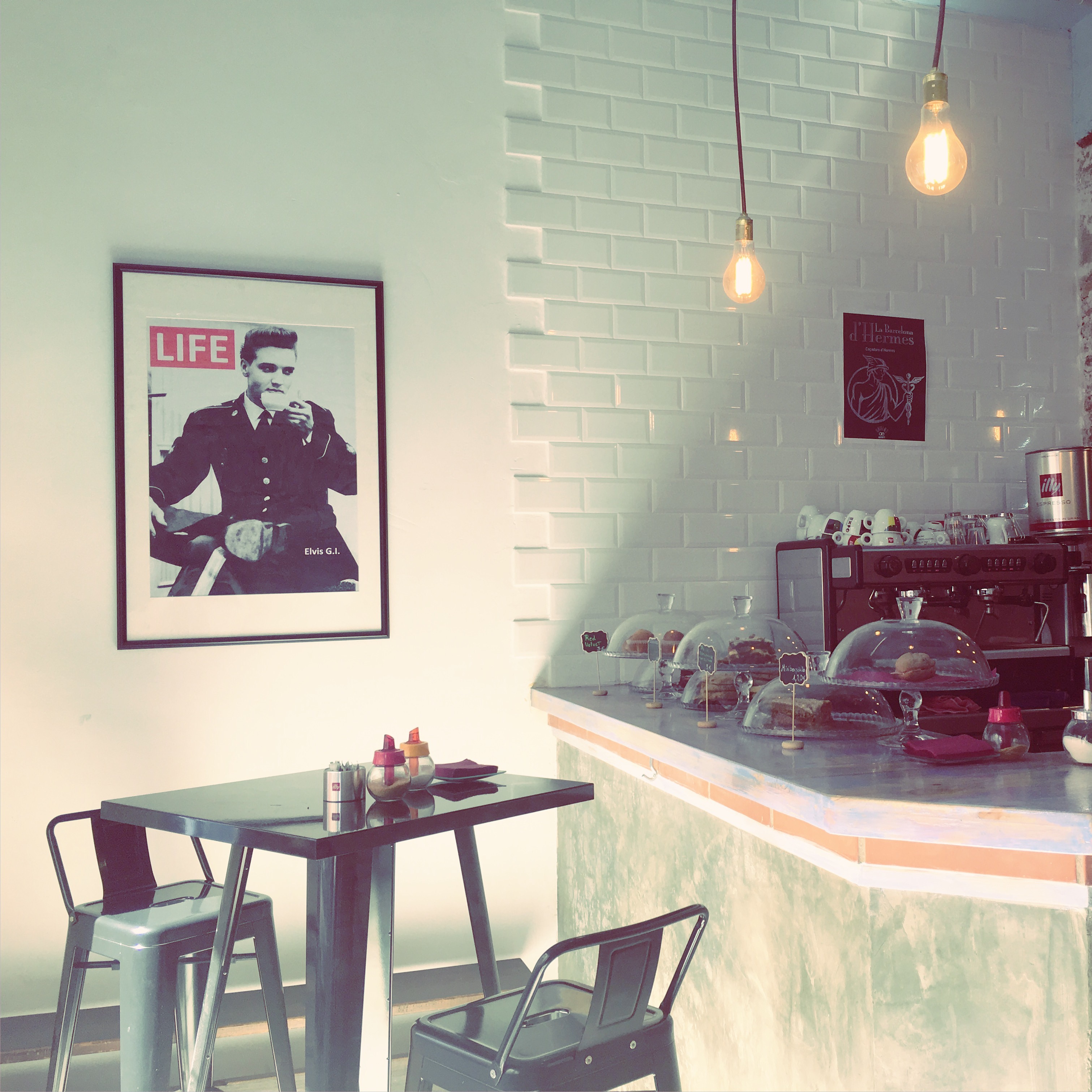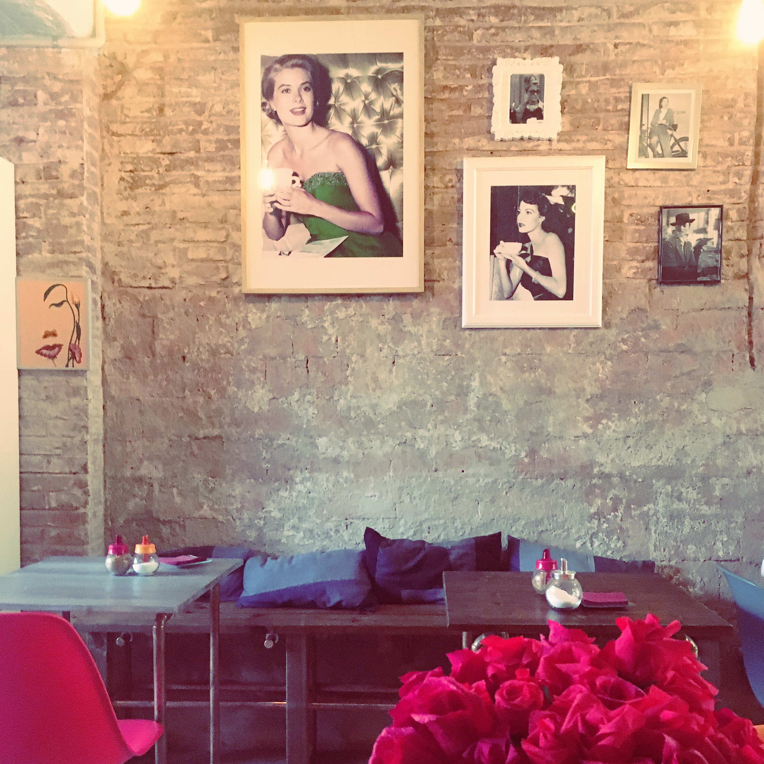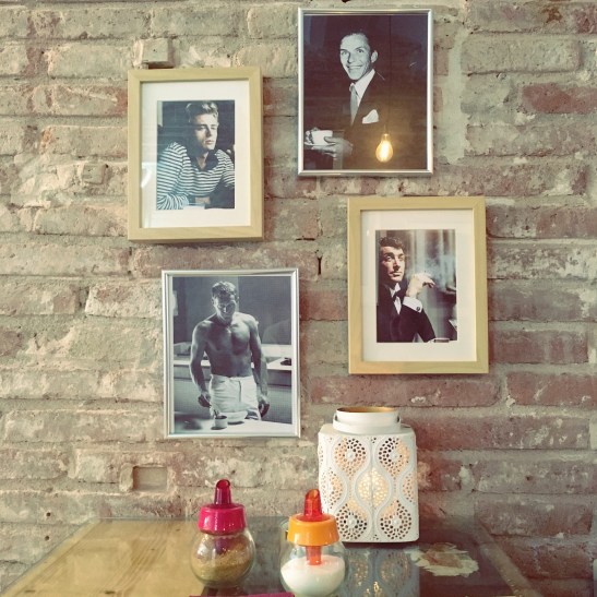 Fixeu-vos amb les parets (d’obra vista, les va descobrir l’Eva quan estaven fent l’obra del local). Totes les fotografies tenen alguna cosa en comú i no és només el fet que es tracti d’actors o cantants coneguts: tots tenen una tassa de cafè o de te a les seves mans ;-).