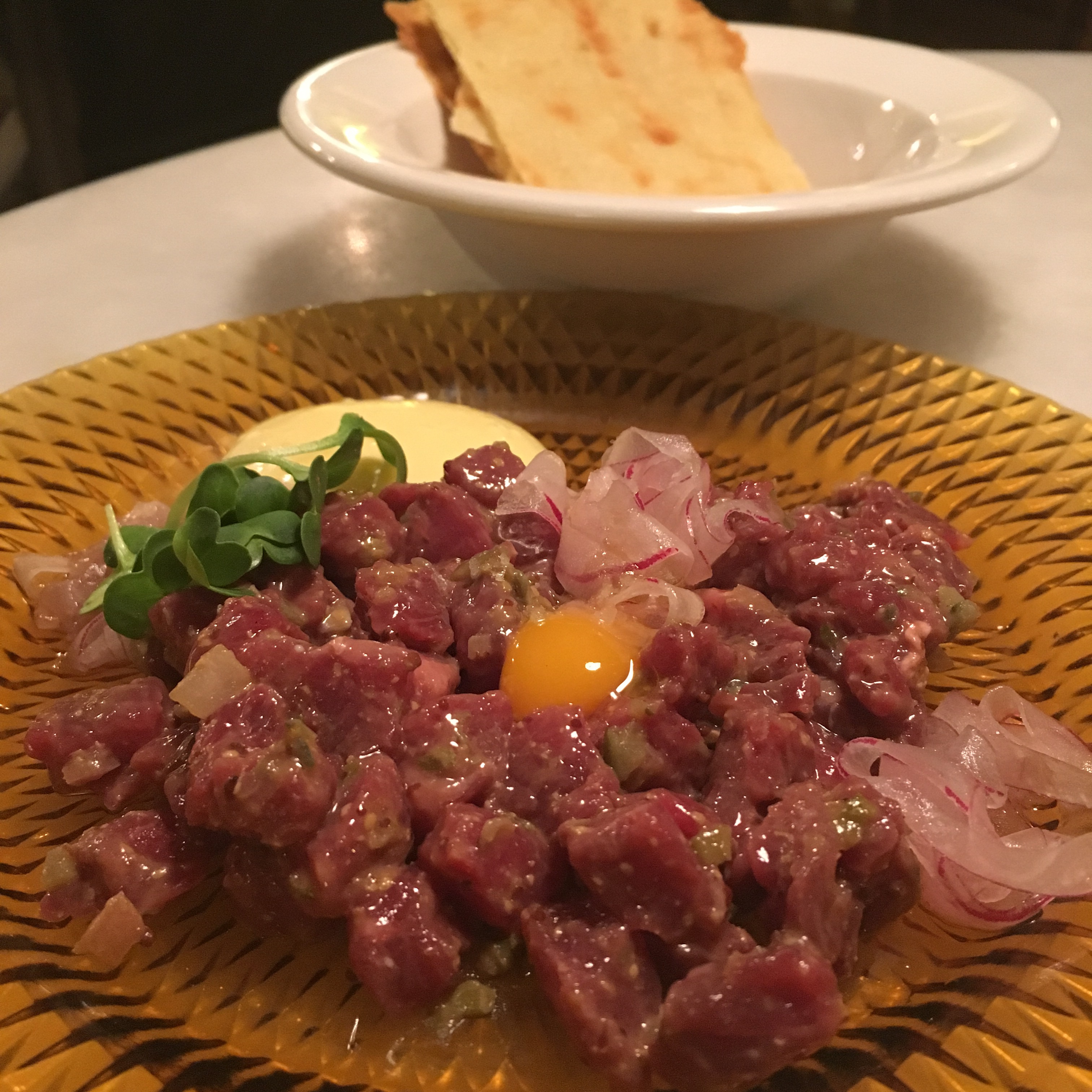 L’steak tartar (10,20 €) va ser un dels millors que he tastat darrerament. Al menys per a mi és molt important que no s’amagui el gust i la qualitat de la carn rere les espècies (de les que sovint s’abusa, o no?). La carn melosa de vaca rossa gallega juntament amb el preparat d’espècies, l’ou i la punteta de mantega trufada van fer que aquest plat fos dels més rodons de la nit.