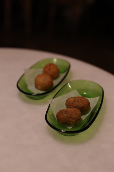 Per començar vam tastar les croquetes de pera i gorgonzola trufada (1,70 €/u) i les de cua de bou i bolets (1,50 €/u). Les meves preferides les primeres. Crec que tenien un pèl més de sabor que les altres -suposo que la gorgonzola n’és la culpable) i ja se sap, el primer que tastes queda amb més força a la memòria del paladar.